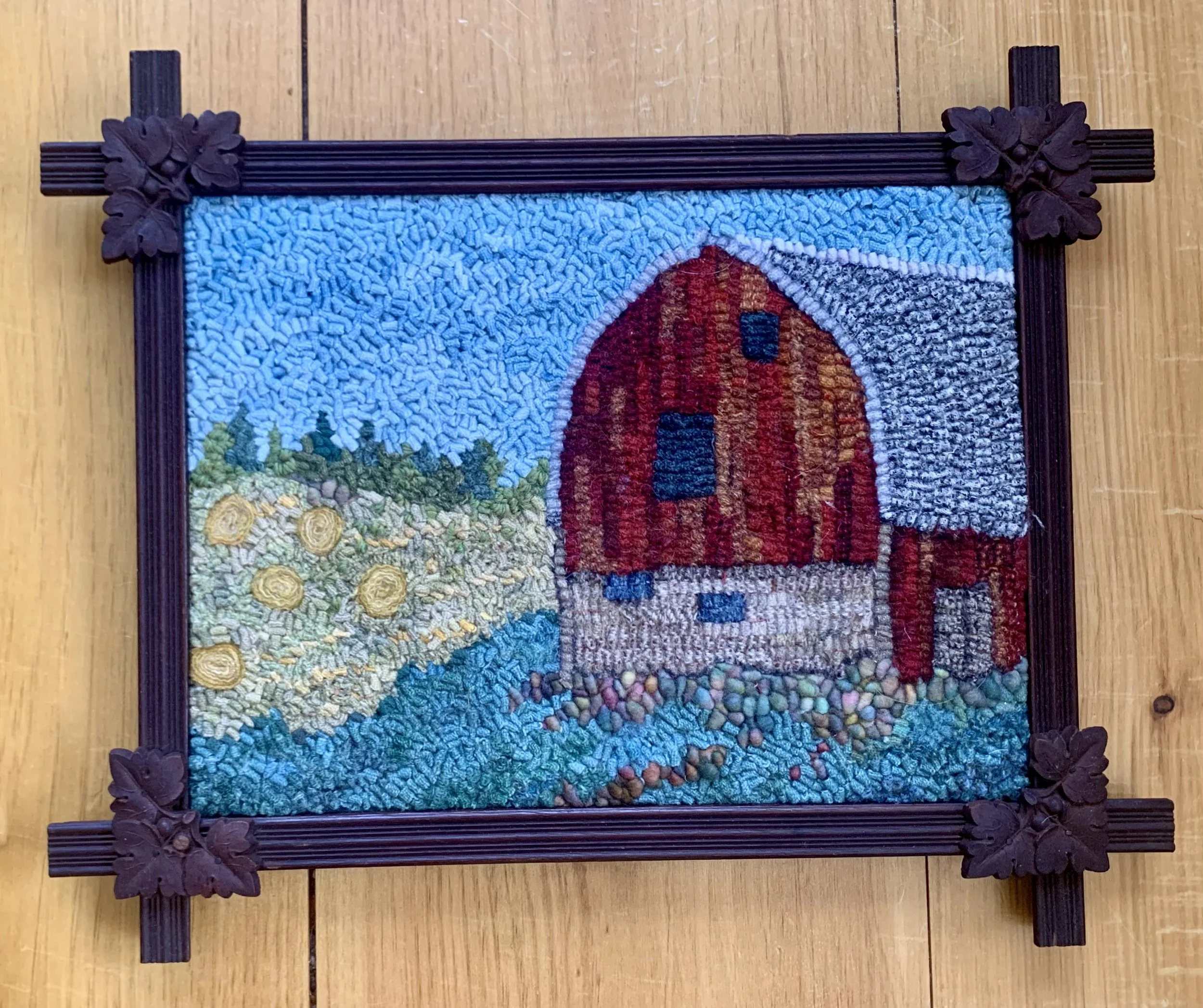 A collection of small hooked landscapes that have been placed in antique wooden carved frames made in the late 1800s and early 1900s. They are sometimes referred to as Adirondeck frames. They are one of a kind. With the exception of the long rectangular one, they are for sale